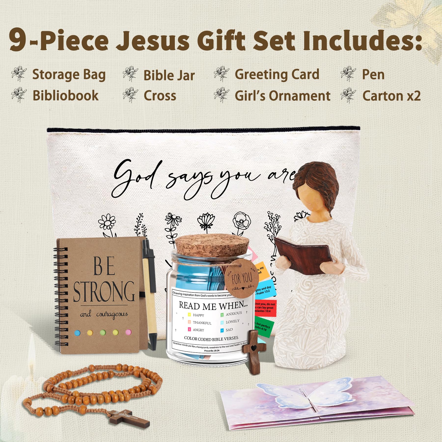 BulletPoint1 : [Faith-Filled Christian Gifts for Women] Surprise her with more than just a gift - this curated set wraps divine encouragement into every piece. From the scripture-stamped Bible jar to the angel figurine and cross bracelet, each item whispers God’s promises. Perfect for moms, sisters, or friends craving daily spiritual reminders, it’s a tangible hug for her heart. Ideal as baptism gifts, birthday surprises, or "get well soon" tokens that heal with hope