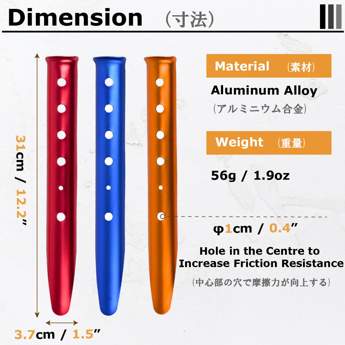 Specification Brand : YAPJEB BulletPoint1 : Premium aluminum construction: Made from high-strength, corrosion-resistant aluminum alloy for durability and lightweight (1.84 oz each)—ideal for sand, snow, and soft soil without weighing down your gear BulletPoint2 : U-shaped anchoring safety design: Bright red, orange and bule colors ensure high visibility in all conditions. Elongated U-shaped base penetrates effortlessly into loose terrain, while a smooth, non-protruding PP plastic head prevents tripping hazards BulletPoint3 : Versatile multi-use performance: Secures tents, canopies, volleyball nets, trampolines, holiday décor, and more. Six reinforced holes offer flexible rigging options for maximum hold in beaches, campsites, or snowy landscapes BulletPoint4 : Stability technique: Drive stakes at a 45-degree angle for optimal grip in shifting sand or snow. Includes six stakes (12.2” x 1.5”) for reliable multi-point anchoring in challenging environments BulletPoint5 : Travel-smart: Ultra-compact design fits seamlessly into backpacks or car kits—perfect for campers, hikers, and beachgoers Color : Orange GpsrSafetyAttestation : 1 ItemName : YAPJEB Tent Stakes Pegs Aluminum U-Shaped 6 Pcs Lightweight Anchor Heavy Duty Ground Nails for Snow Sand Beach Shade Canopy Hiking Backpacking Boating Picnic (Orange) ItemPackageDimensions_Height : 33.29 centimeters ItemPackageDimensions_Length : 3.5 centimeters ItemPackageDimensions_Width : 6.8 centimeters ItemTypeKeyword : tent-stakes Manufacturer : YAPJEB Material1 : Aluminum Material2 : Metal ModelNumber : YB-3316 NumberOfPieces : 1 PartNumber : YB-3316 ProductDescription : Secure Your Shelter Anywhere Don't let shifting sand, soft soil, or gusty winds ruin your outdoor adventure. Our premium 6-pack of U-shaped aluminum tent stakes is engineered to provide exceptional anchoring power wherever your journey takes you – be it a sun-drenched beach, a windswept mountain campsite, a snowy getaway, a relaxing picnic spot, or a day out on the boat. Built for Performance & Durability Robust U-Shaped Design: The wide U-profile creates maximum surface area contact with the ground, offering significantly superior holding power and resistance to bending or pulling out compared to standard stakes, especially in loose or unstable substrates like sand, snow, and soft earth. Heavy-Duty Aluminum Construction Made from high-strength, lightweight aluminum alloy, these stakes withstand substantial force without snapping or deforming under pressure. Aluminum naturally resists rust and corrosion, ensuring longevity season after season, even in saltwater beach or damp environments. Size : 1.02 ft (31 cm) Style : Flat Top UnitCount : 1 UnspscCode : 30241511
