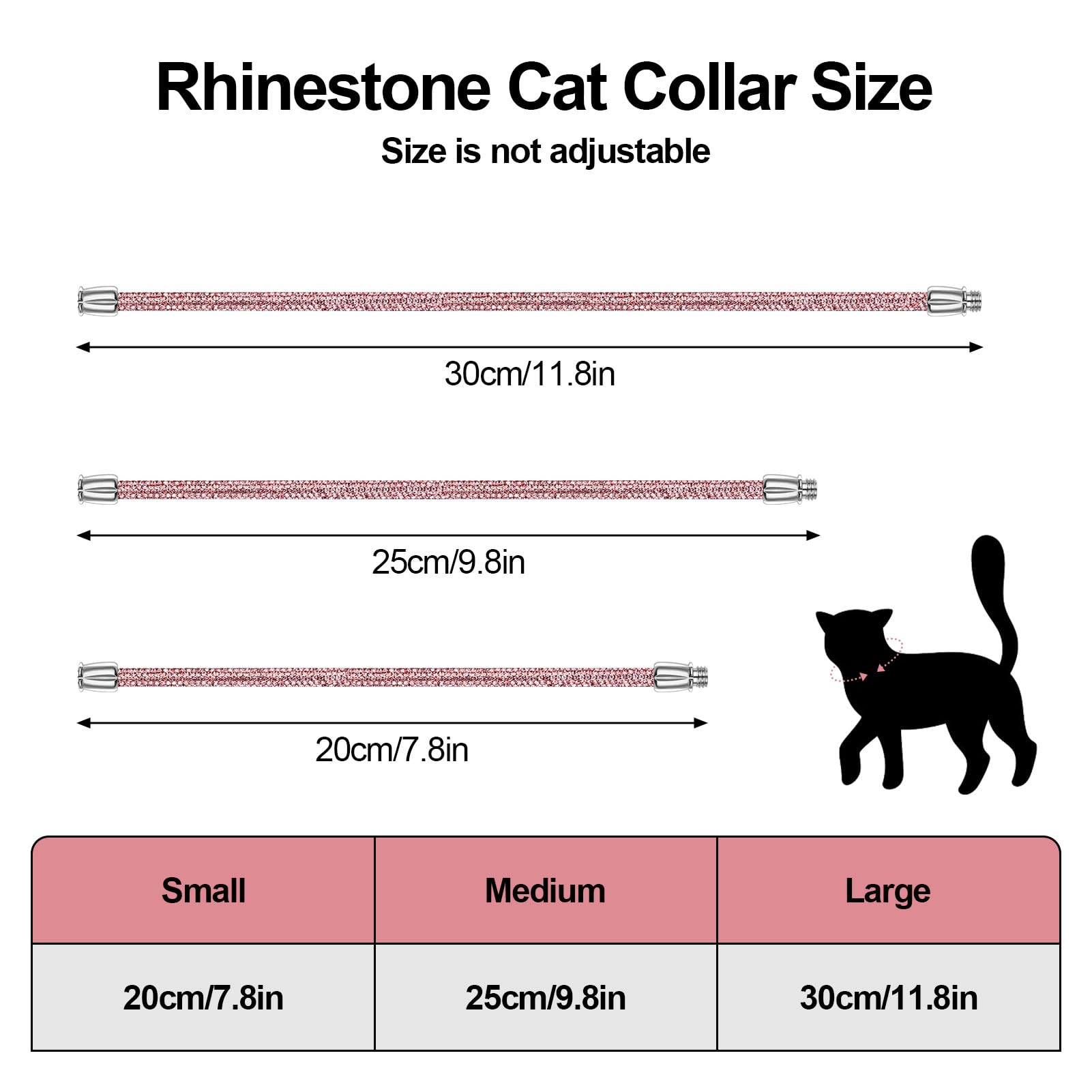 BulletPoint3 : SUITABLE FOR YOUR PETS:Fancy cat collars are available in three sizes: small (20 cm/7.8 inches), medium (25 cm/9.8 inches) and large (30 cm/11.8 inches), with a diameter of 0.6 cm for the collar itself. They are comfortable to wear and suitable for a variety of small pets such as Chihuahuas, Pomeranians and Persian cats.