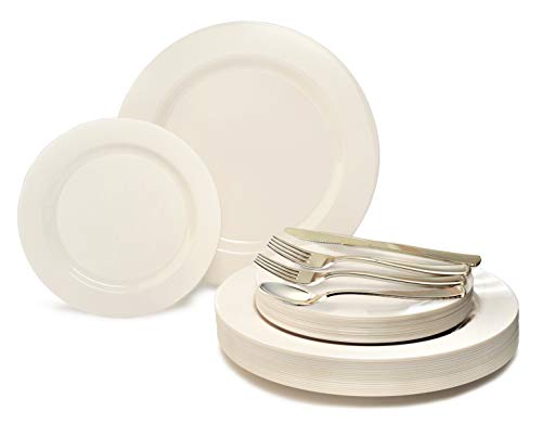 Specification Brand : OCCASIONS FINEST PLASTIC TABLEWARE BulletPoint1 : Combo for 120 guests Includes: 120 Pieces 10.5'' Dinner Plates, 120 Pieces 7.5'' Appetizer / Dessert Plates + BulletPoint2 : 240 plastic forks, 120 plastic spoons, 120 plastic knives (Gold coated) BulletPoint3 : Design / Color : Plain Ivory, Gold Silverware BulletPoint4 : Made out of high gloss premium rigid disposable plastic. BulletPoint5 : Single Use - Recyclable and BPA free CareInstructions : Microwave-safe, Oven-safe up to 220°C for 20 minutes, Freezer-safe. Hand-wash only. Collection : All Color : B. Plain Ivory, Gold Silverware FinishType : Smooth GpsrSafetyAttestation : 1 IsMicrowaveable : 1 ItemName : " OCCASIONS " 720 Pcs set (120 guest) Wedding Disposable Plastic Plate and Silverware Combo 10.5" + 7.5" + Silverware (Double Fork) (Plain Ivory Plates, Gold Silverware) ItemPackageDimensions_Height : 34.3916 centimeters ItemPackageDimensions_Length : 17.399 centimeters ItemPackageDimensions_Width : 17.5006 centimeters ItemShape : Round ItemTypeKeyword : disposable-plates Manufacturer : OCCASIONS FINEST PLASTIC TABLEWARE Material : Plastic Material1 : Bamboo Material2 : Bagasse NumberOfItems : 300 NumberOfPieces : 300 OccasionType : Wedding PackageLevel : case Pattern : Solid PatternType : Solid ProductDescription : Zero Waste and Zero Pollution As we all know, traditional disposable plastic products have brought a lot of trouble to our earth, it takes hundreds of years to degrade. ECOLipak disposable paper plates are made of sugarcane fiber, a fast-growing plant. They are plastic-free and tree-free, it is the best substitute for the traditional disposable paper plates or plastic plates 6-inch 300 pack square paper plates Set includes 300 pack 6 inch disposable square paper plates. Large PACK for all your needs! These plates are made of rapidly renewable plants. After the party, you won't have to worry about those messy plates, they can be put directly into the compost bin, saving clean-up time, so that you have more time to spend with family and friends. Safe and secure ECOLipak are committed to providing good quality disposable plates. Our disposable paper bulk plates are made of sugarcane bagasse, a food grade material. They have no wax lining, gluten-free, plastic-free and BPA-free. You can enjoy your meal with peace of mind. Sturdy and Durable ECOLipak compostable dinner plates are very sturdy, oil and heat resistant and cut resistant, as well as microwave and refrigerator safe! They can hold food securely. When you use them, you don't need to worry about them breaking. All kinds of Occasions ECOLipak large pack disposable biodegradable plates are suitable for parties, picnics, class reunions, family dinners, daily and other occasions. You can apply them on a nice holiday to enjoy a variety of dishes such as barbecue, pasta, steak and more. Enjoy the convenience and joy of ECOLipak disposable compostable dinner plates! ProductSiteLaunchDate : 2020-01-08T20:40:13.926Z Size : 720 pcs (120 guests) Style : Tableware SupplierDeclaredDgHzRegulation : not_applicable UnitCount : 300 UnspscCode : 52152000